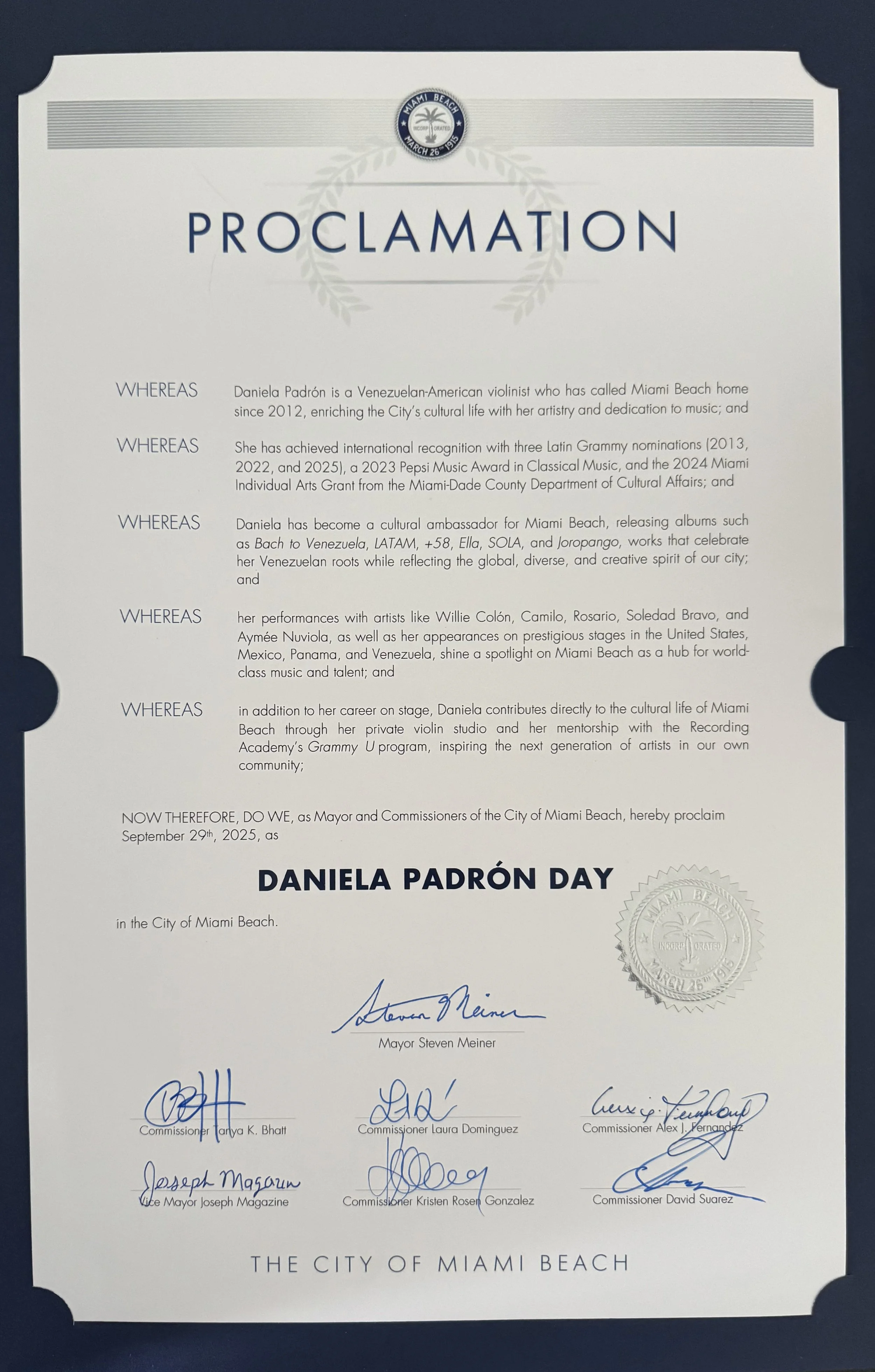 El 29 de septiembre de 2025 ha sido oficialmente proclamado el DÍA de DANIELA PADRÓN por el Alcalde y los Comisionados de la ciudad de Miami Beach.